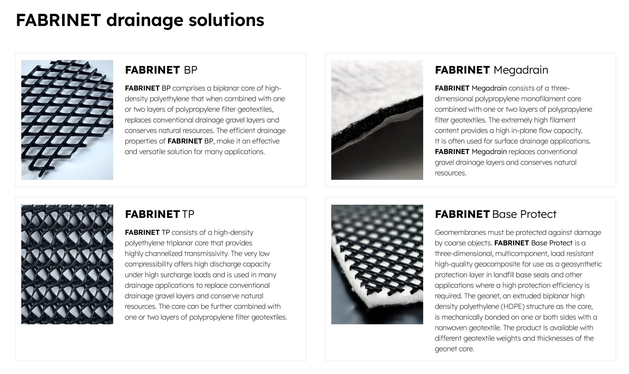 GSE Fabrinet je moderný geokompozitný materiál, ktorý kombinuje netkanú geotextíliu s vysokohustotnou polyetylénovou (HDPE) geomriežkou HyperNet. Táto kombinácia poskytuje vysokú mechanickú pevnosť, chemickú odolnosť a dlhodobú stabilitu, ideálnu pre náročné stavebné a environmentálne projekty.
